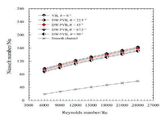 Eiamsa-ard et al. [ 59 ] investigated the effect of delta-wing V-baffles on mean Nusselt number, local Nusselt number distribution, pressure loss, and thermal performance within a duct with Reynolds numbers ranging from 6000 to 24000. The geometric characteristics of the delta-wing V-baffle were investigated in terms of relative blockage and pitch ratios (BR = 0.3 and PR = 1.5), as well as five delta-wing angles of attack (θ =0°, 22.5°, 45°, 67.5°, and 90°). Experimental results indicated that smaller delta-wing angles of attack (θ) resulted in increased heat transfer and friction factor compared to larger θ values. In addition, the Nu/Nus ratio tended to increase as the Reynolds number decreased. The Nusselt number shows a significant increase when a delta-wing V-shaped baffle is used, as shown in Figure 14.